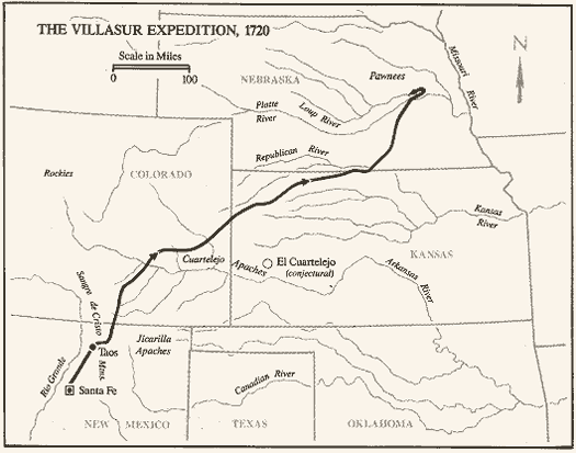 En 1720 La expedición Villasur fue una expedición militar ( 45 soldados, 60-70 indios pueblo auxiliares, y unos 12 guías apaches, con el propósito de inspeccionar la creciente 0301_011301presencia francesa en la región norteamericana de las Grandes Llanuras. Las tropas españolas, dirigidas por Pedro Villasur, fueron derrotadas por los pawnee y sus aliados franceses en el actual estado de Nebraska. La expedición, que había viajado más al norte y al este que cualquier otra expedición militar española, marcó el fin temporario de la influencia española en el centro de las Grandes Llanuras, hasta que España las recuperó en 1762 mediante el Tratado de Fontainebleau, que creó la enorme gobernación de la Luisiana española.