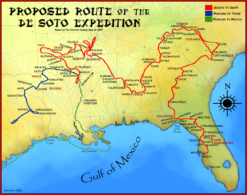 En 1539, Hernando de Soto, al frente de una expedición de entre 600 y 700 hombres, exploró el interior de los actuales EEUU. Desde la Florida, cruzaron Georgia, Carolina  del Sur y del Norte y Tenesse y llegaron al Misisipí, siendo el primer europeo en avistarlo. Siguieron por la actual Arkansas, Oklahoma, y Texas. En invierno se estableció en Autiamique, en el río Arkansas. Tras muchas penurias, Soto murió y la expedición regresó en siete barcos que construyeron aguas abajo por el Misisipi. Luego costearon hasta llegar a la ciudad española de Pánuco, en Veracruz, que había sido fundada en 1522 por Cortés. Sobrevivieron unos 300 hombres.