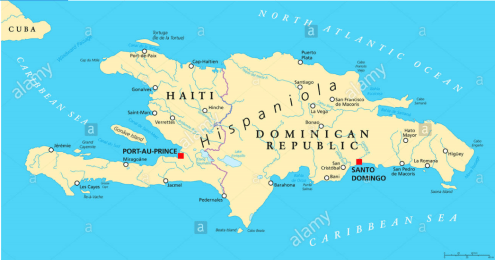 Es la segunda isla mas grande del Mar Caribe, después de Cuba, con una superficie de 76.480 km² y cinco grandes cadenas montañosas. Tiene una longitud de 650 km y una anchura máxima de 241km. El 5 de diciembre, el almirante Cristóbal Colón entró a la Isla por el cabo de San Nicolás, situada en el extremo occidental de la costa norte.