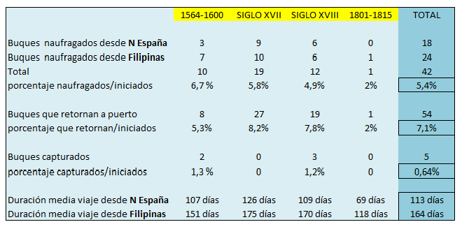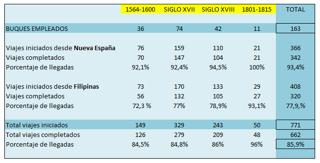 Durante 250 años, entre 1565 y 1815, la línea del galeón de Manila, realizó en el Océano Pacífico entre Nueva España y las islas Filipinas, un total de 662 viajes o travesías marítimas, utilizando para ello 163 embarcaciones (naos, pataches, carabelas, galeones, goletas, paquebotes, bergantines, fragatas y navíos de línea). Del cuadro resumen, destaca que el 85,9% de los viajes iniciados llegaron a su destino.