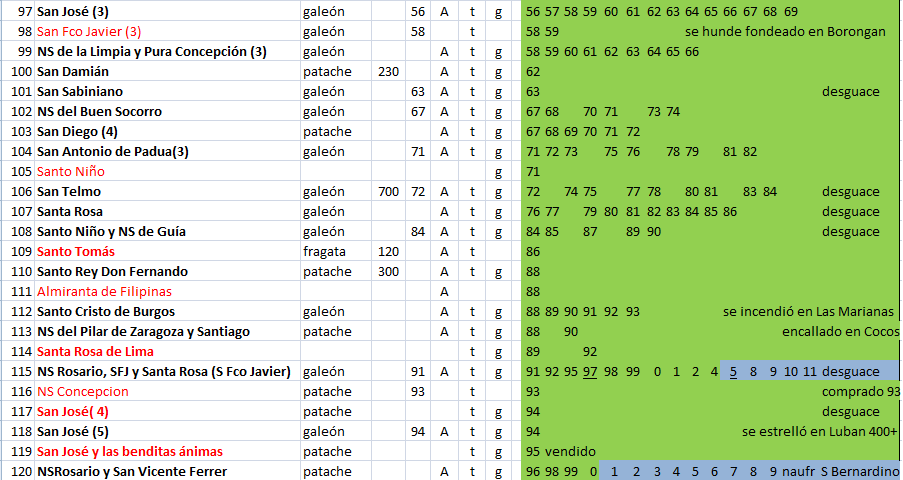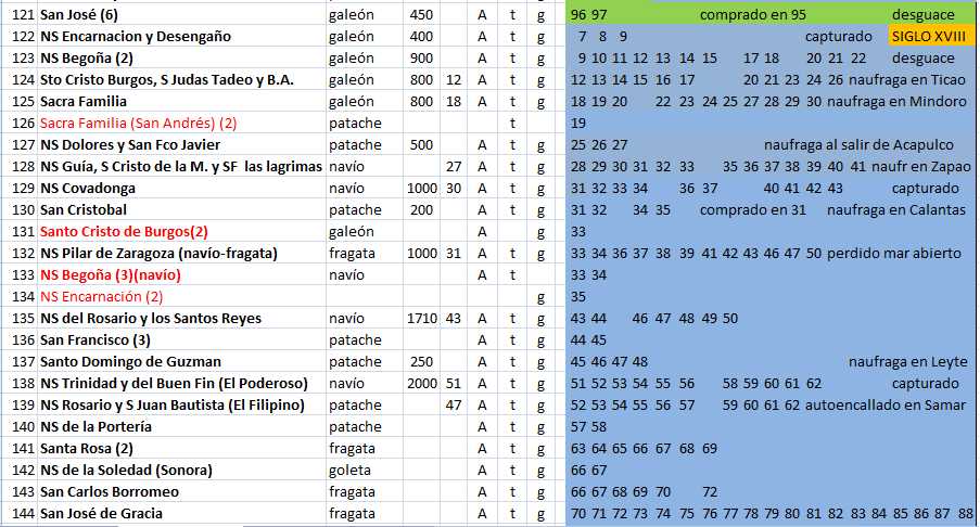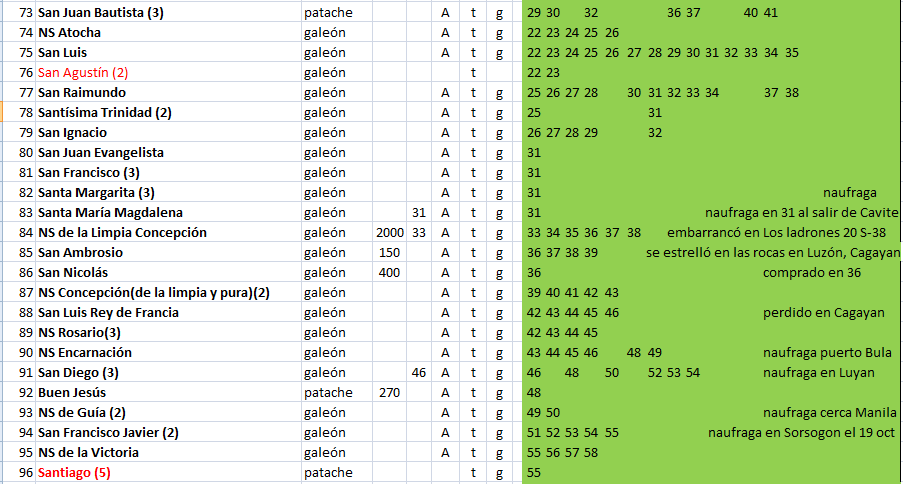 Finalmente están los 27 buques que se mencionan en una sola fuente, (en el listado en rojo débil). (13 corresponden a la lista G de Bruce Cruikshank, otros 13 a la de Todoavante y 1 a la del Archivo de Indias)