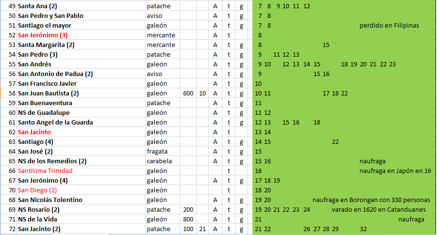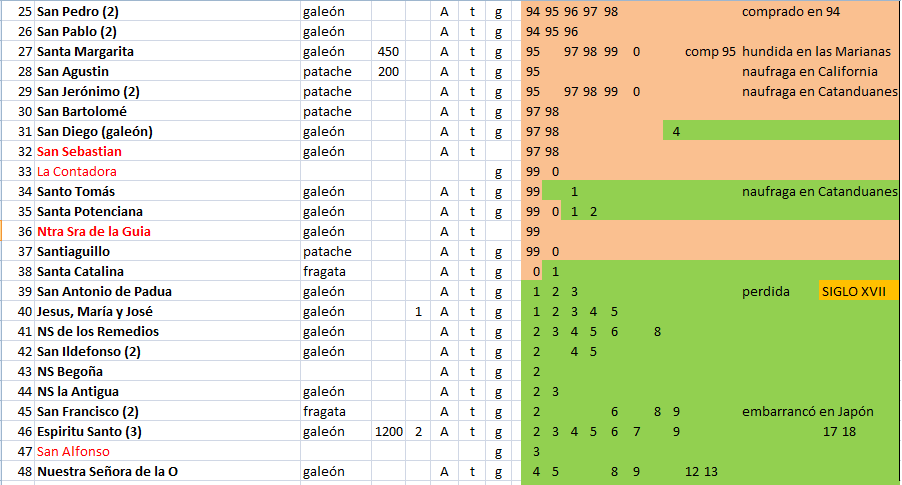 En el siguiente cuadro, se listan todos los buques mencionados de forma cronológica. A cada siglo le corresponde un color, reflejándose los años en que navegaron en la Carrera de Filipinas según las fuentes. La columna <Tn> refleja el tonelaje de desplazamiento. En la columna <año>, el año en el que fue construido. La columna <A> corresponde al Archivo de Indias, la <T> al blog Todoavante y la <G> al listado de Bruce Cruikshank.