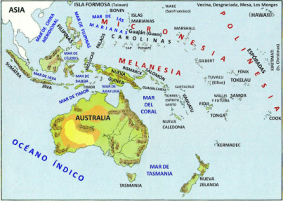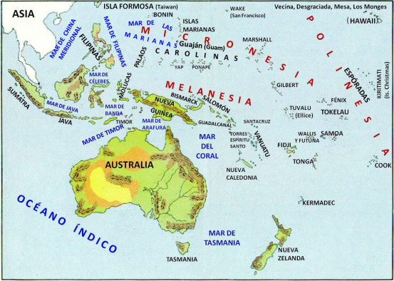 Filipinas, Marianas, Carolinas, Los Pintados (Marshall), Marquesas, Salomon, Nueva Guinea, Nuevas Hébridas (Vanuatu), Palaos, Santa Catalina (Gilbert o Kiribati), Nombre de Jesús (Tuvalu), islas Infortunadas (Tuamoto), San Juan Bautista (Pitcairn), Torres, Almirantazgo, Arzobispo (Bonin, Ogasawara), Volcanes (islas Volcano), y Santa Cruz. Los «descubrimientos” británicos del siglo XVIII en el Pacífico se harían con mapas españoles y portugueses.