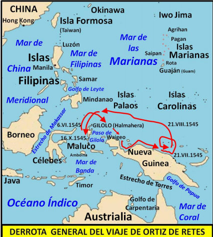 el rumbo hacia el sur y buscando corrientes propicias para marear en dirección a las Indias, avistando las islas nombradas como la Sevillana (Supiori), la Gallega (Noemfer), las Mártires (Schouten). Después de adentrarse por el estrecho de Japen, reconoció la costa norte de la isla de Nueva Guinea de la que tomó posesión, y a la que dio nombre en razón de la piel oscura de los melanesios. Después de arribar a las islas Kumamba y avistar islas volcánicas como Magdalena, Gaspar Rico, las Volcanes y las Barbada Caimana, tuvieron que volver debido a los vientos y corrientes contrarios.