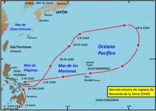 Bernardo de la Torre al mando de la nave San Juan de Letrán saliendo de la isla de Sarangani el 4 de agosto de 1543. Después de navegar por el estrecho de San Bernardino entre Samar y Luzón, descubrió nuevas islas como la actual Okinotorishima, posiblemente la isla Marcus (actual Minamitorishima) y algunas de las islas Bonin (Ogasawara), a las que llamó islas del Arzobispo, las islas Volcano y la isla de Iwo Jima. Pero el objetivo no se logró por los vientos desfavorables.