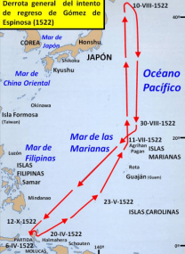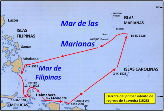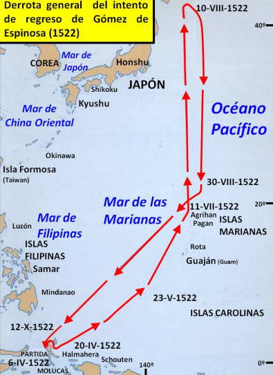 lado opuesto al que ya lo había logrado Portugal. Por el camino descubrieron Guam y las islas Marianas. Luego, con el navío Trinidad al mando de Gonzalo Gómez de Espinosa se hizo el primer intento de tornaviaje a América sin lograrlo.
