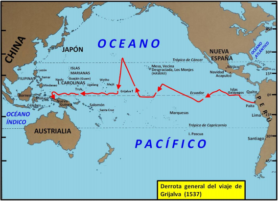 Una vez cumplida su misión, el navío Trinidad volvería a México, y el Santiago con Grijalva al mando, navegaría hacia el oeste desde el puerto peruano de Paita en abril de 1537. Descubrieron algunas islas en las Line y las Gilbert y establecieron una marca de permanencia en el mar sin escalas ni avistamientos, antes de acabar el navío destrozado en aguas de Nueva Guinea. Los supervivientes fueron rescatados por el gobernador portugués de las Molucas. Su conato de volver a medio camino a Nueva España, no puede considerarse como un intento de tornaviaje desde Asia.