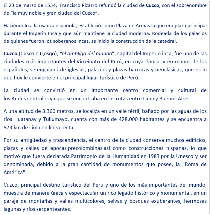 Otorgado por real cédula de 19 de julio de 1540, del rey Carlos I de España  a la «Muy insigne, muy noble, leal y fidelísima ciudad del Cuzco, la mas principal y cabeza de los reynos del Perú«