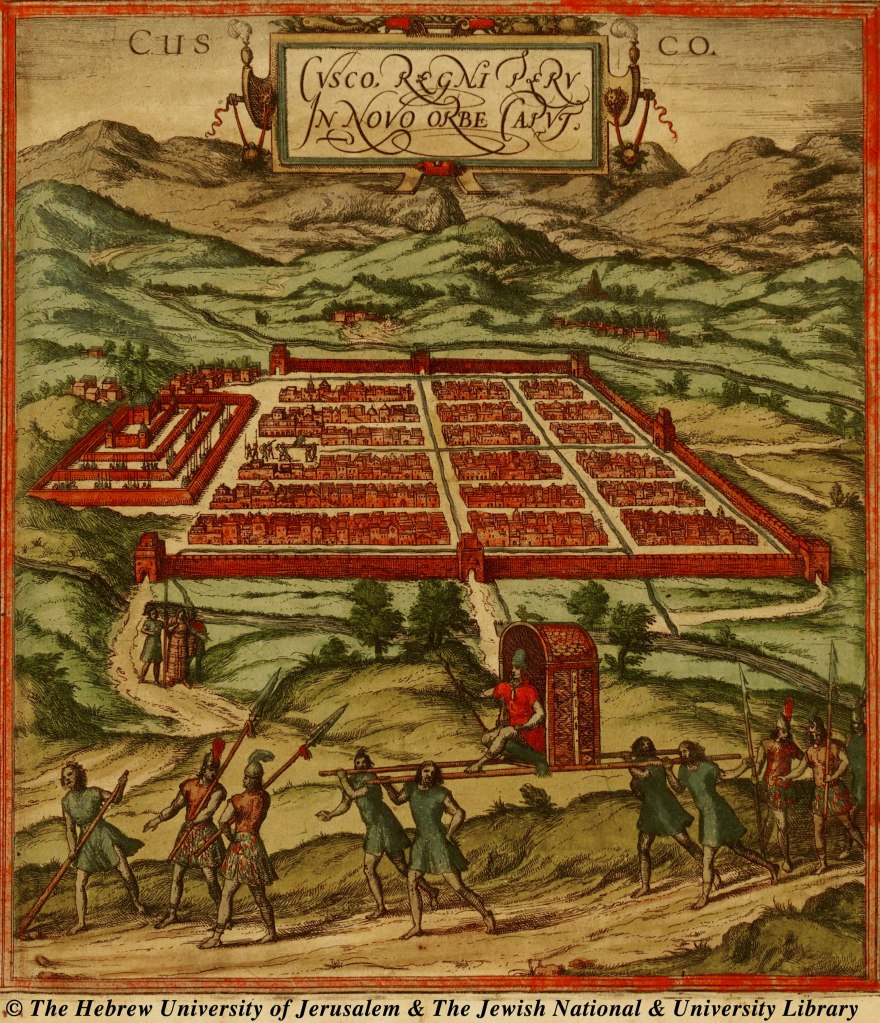 Cuzco en una lámina del libro de Georg Braun, Civitates orbis terrarum, publicado em Amberes en 1572. Biblioteca Nacional de España, Madrid