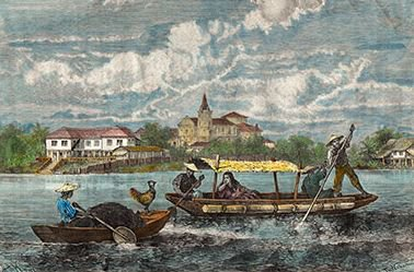 Río Pasig en la bahía de Manila. Grabado de Kohl de 1886 sobre un dibujo de Weber y coloreado a la acuarela.