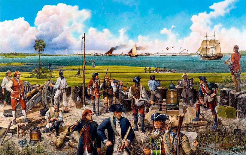 Los cañones de Anastasia , óleo sobre tabla, 42 x 66) de Jacson Walker. Escena del asedio a San Agustín en 1740. En primer plano vemos una batería británica situada en la isla de Anastasia, disparando contra la ciudad española de San Agustín en Florida.
