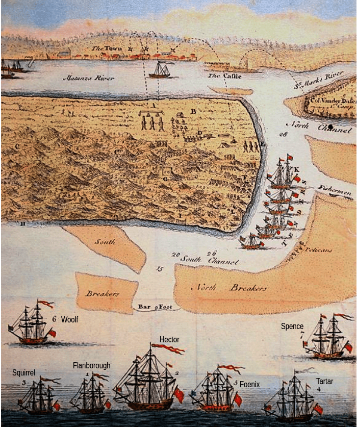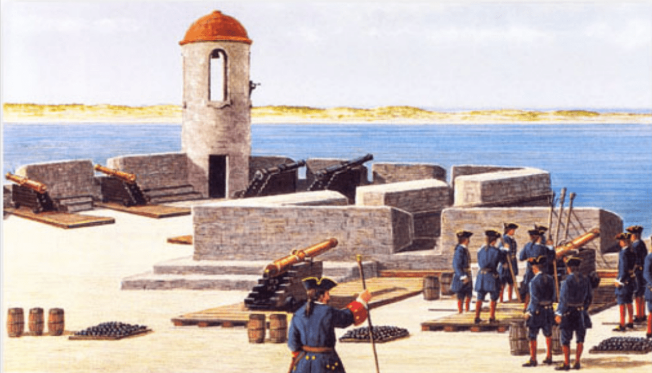 Los cañones de Anastasia , óleo sobre tabla, 42 x 66) de Jacson Walker. Escena del asedio a San Agustín en 1740. En primer plano vemos una batería británica situada en la isla de Anastasia, disparando contra la ciudad española de San Agustín en Florida.