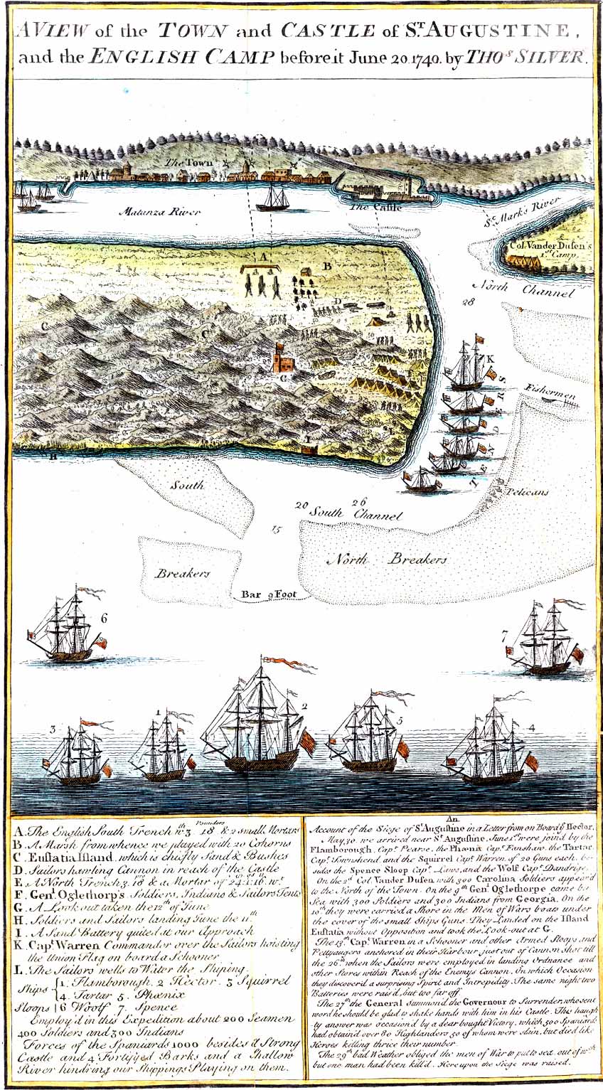 Una vista de la ciudad y el castillo de St. Augustine, y el campamento inglés antes. Este es un mapa en perspectiva de San Agustín que muestra un relato del asedio de San Agustín junto con una carta a bordo del barco Hector, alrededor de 1740. El mapa es bastante detallado y muestra los barcos con sus nombres en una clave, una clave para características físicas y posiciones de tropa, casas, Castillo de San Marcos (castillo), pozos de agua y campamentos militares. El texto de la carta debajo del mapa que explica el asedio en detalle. Thomas Silver, (Londres, : , 1742).