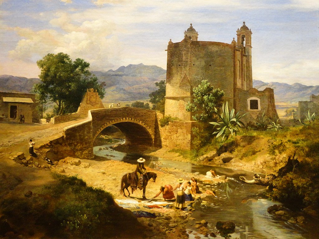 El Puente de San Antonio junto a la capilla del siglo XVII, en el camino de San Ángel y el río Magdalena junto al punto llamado Panzacola en Coyoacán, por Eugenio Landesio 1855.
