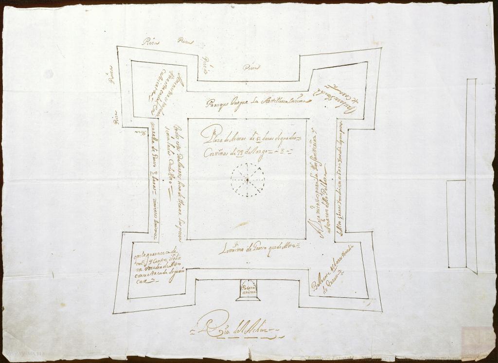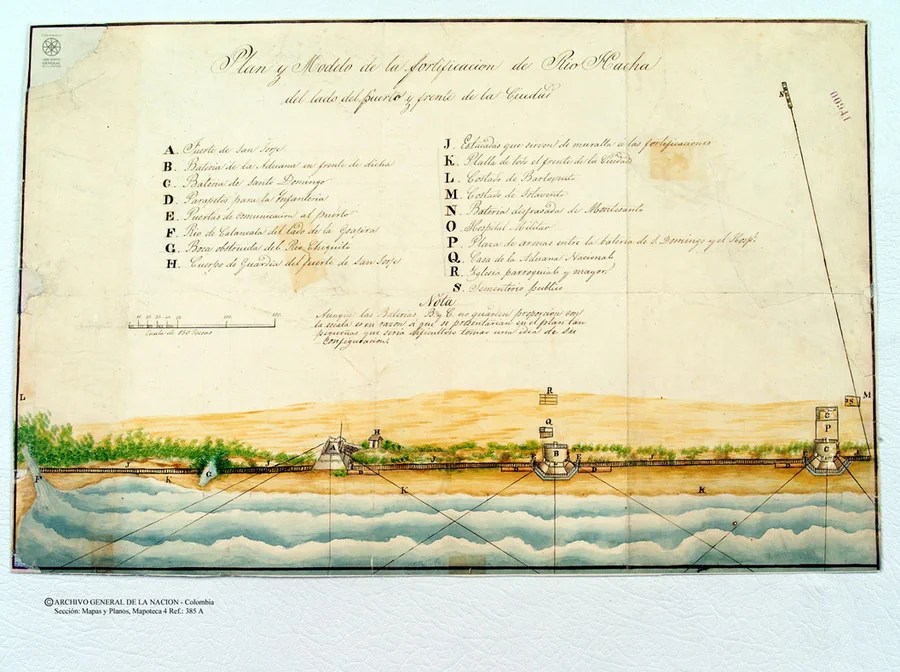 Plano de la fortificación de Riohacha, del lado del puerto y frente de la ciudad. 1800.