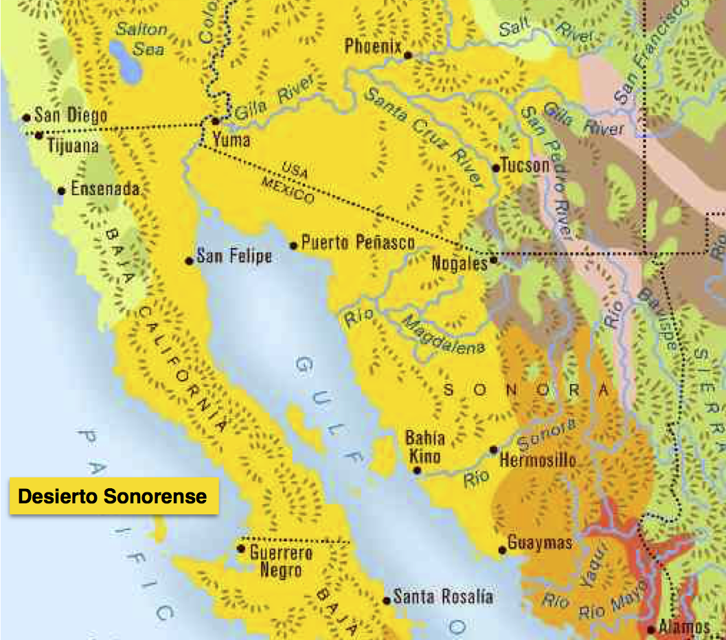 El gran desierto de Sonora de más de 300.000 kilómetros cuadrados se extiende cubriendo gran parte de Arizona, Alta y Baja California, Sinaloa y Sonora. Forman parte del mismo los desiertos de Arizona, del Colorado, del río Gila y el de Yuha.
