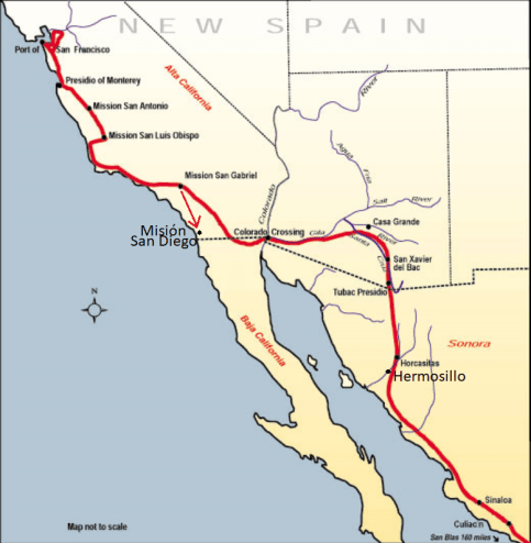 La comunicación terrestre entre la provincia virreinal de Sonora y el puerto de Monterrey en la Alta California no existía hasta entonces, pues aunque el terreno era conocido el abastecimiento por tierra era muy complicado, con un acceso difícil por el extenso y duro desierto de Sonora y la hostilidad de los indios de la zona.