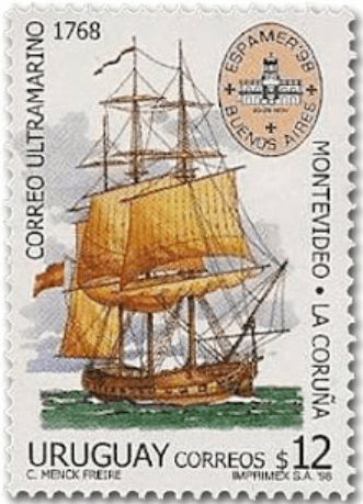 Fragata La Princesa. Sello editado por la Administración Nacional de Correos de Uruguay, para conmemorar el 200 aniversario del primer correo ultramarino Montevideo-A Coruña-Montevideo.