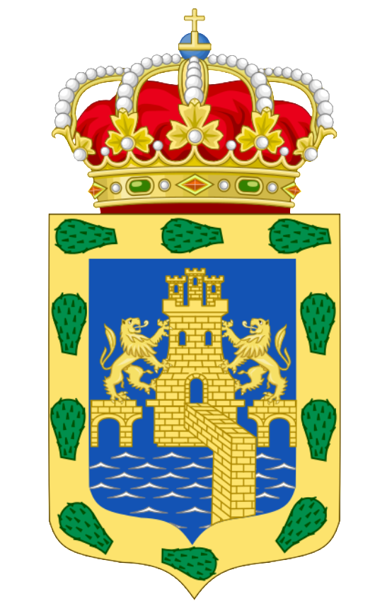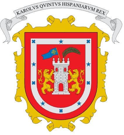 Mérida. Por cédula real de 8 de agosto de 1618 en el Monasterio de San Lorenzo el Real, Felipe III de España otorga Privilegio de Armas a Mérida de Yucatán de las Indias, “en premio a su fidelidad y buenos servicios”. «Un escudo partido, verticalmente de arriba abajo, en dos cuarteles iguales. El primero (izquierda) en campo (azul) ostenta un castillo de oro, y el segundo (derecha) un león rampante de oro en campo de sinople (verde). El escudo va timbrado, rematado en su cúspide, con corona real abierta»