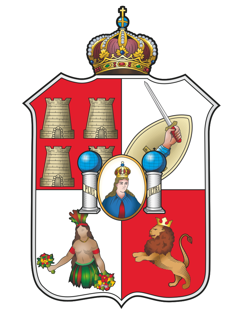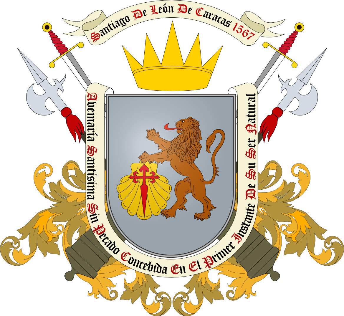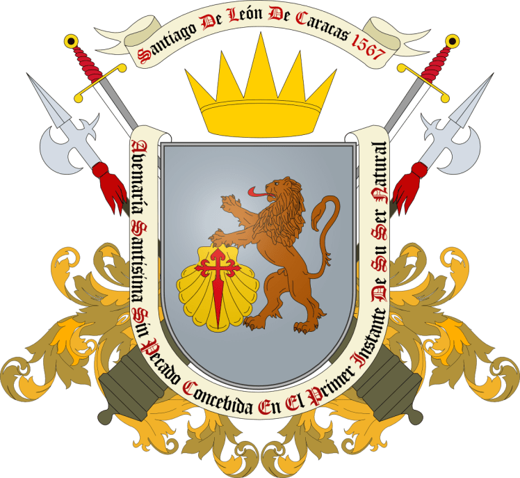 Santiago León de Caracas. Escudo concedido por el rey Felipe II mediante real cédula de 4 de septiembre de 1591. “En campo de plata un León de color pardo, puesto en pie, teniendo entre los brazos una venera de oro con la Cruz roja de Santiago, y por timbre un coronel de cinco puntas de oro”. Desde el Pardo, a 13 de marzo de 1766, el rey Carlos III dispone que la orla del escudo sea en los precisos términos de AVE MARÍA SANTÍSIMA SIN PECADO CONCEBIDA EN EL PRIMER INSTANTE DE SU SER NATURAL.