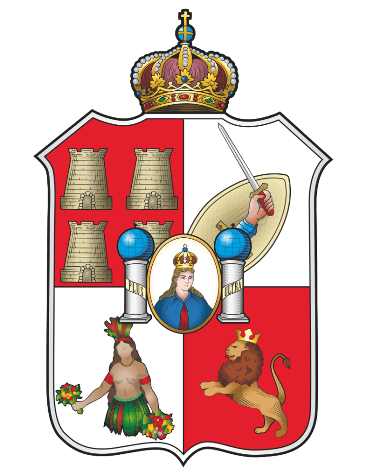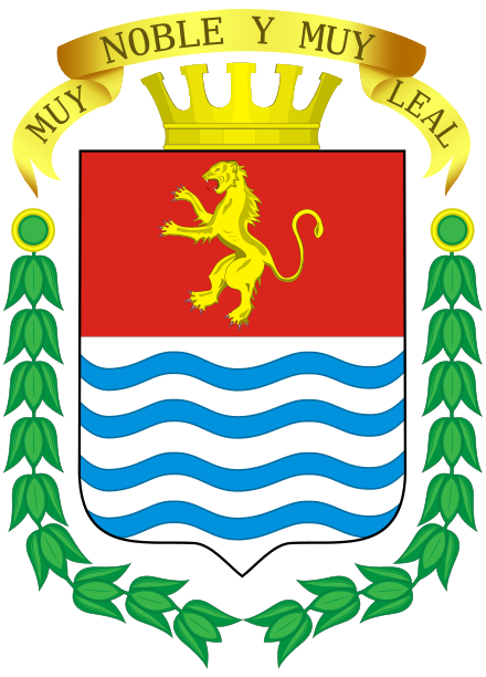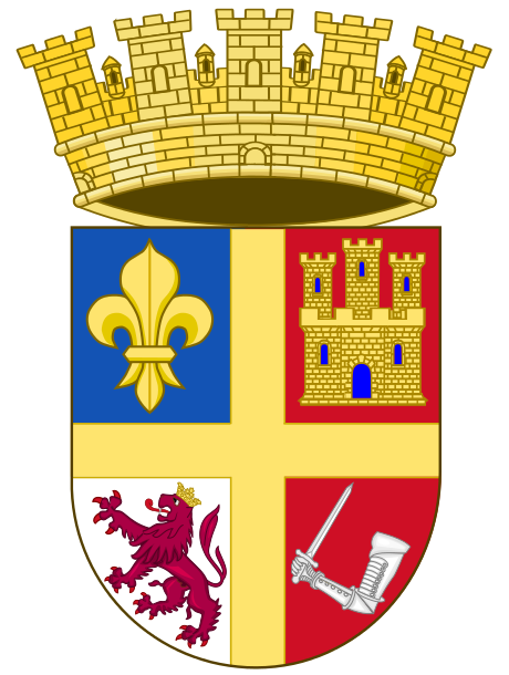 Manila. Escudo otorgado por Real cédula del rey Felipe II en 30 de mayo de 1596. «Que en la mitad de la parte superior tenga un castillo de oro en campo colorado y cerrado con puerta y ventanas azules, y una corona encima, y en la parte interior y en campo azul, medio león y medio delfín de plata, armado y lampasado de gules, que son uñas y lengua coloradas, teniendo dicho león en su pata una espada con su guarnición y puño».