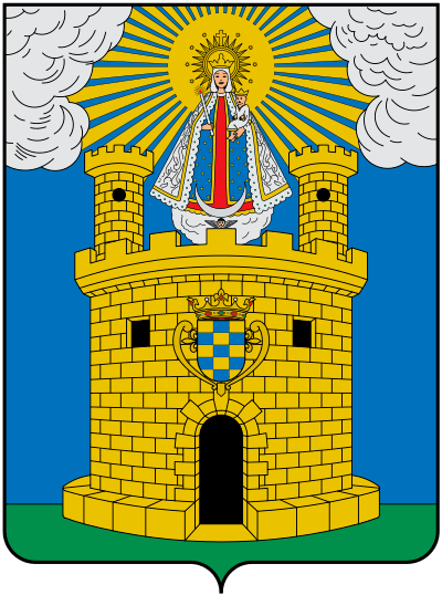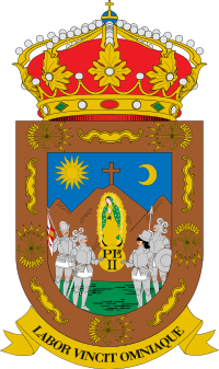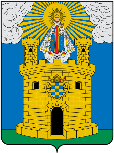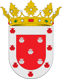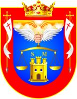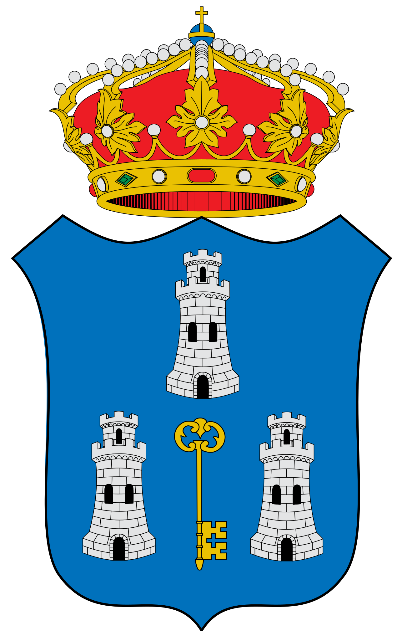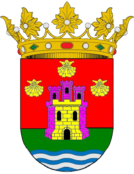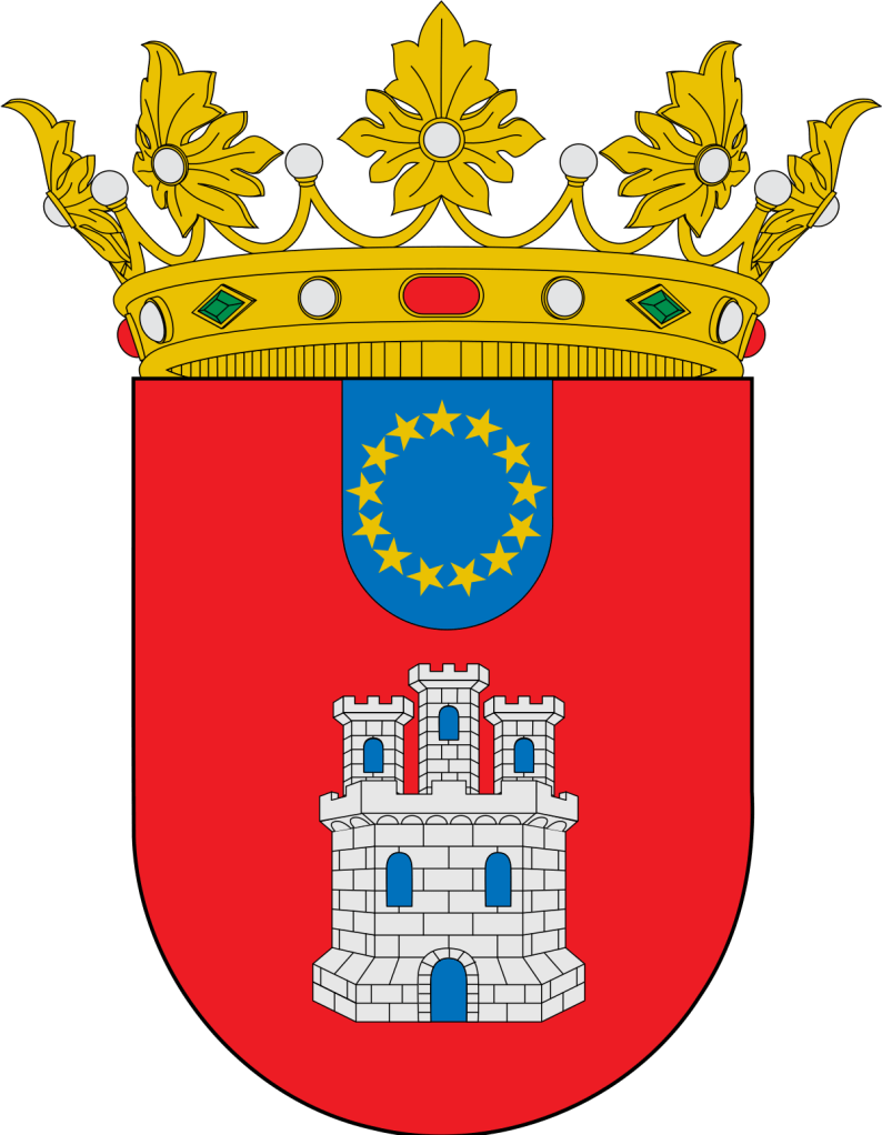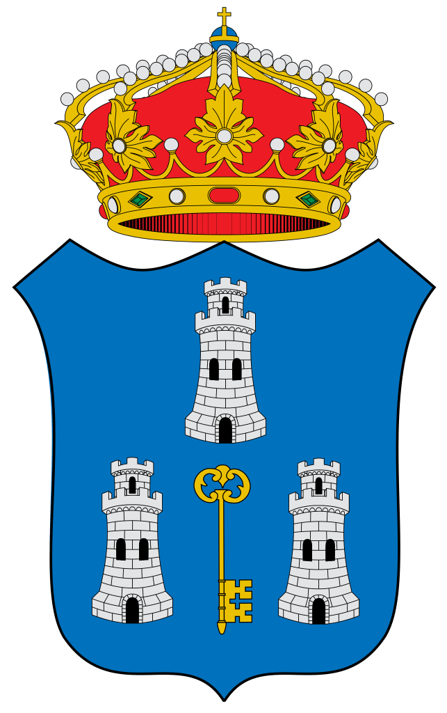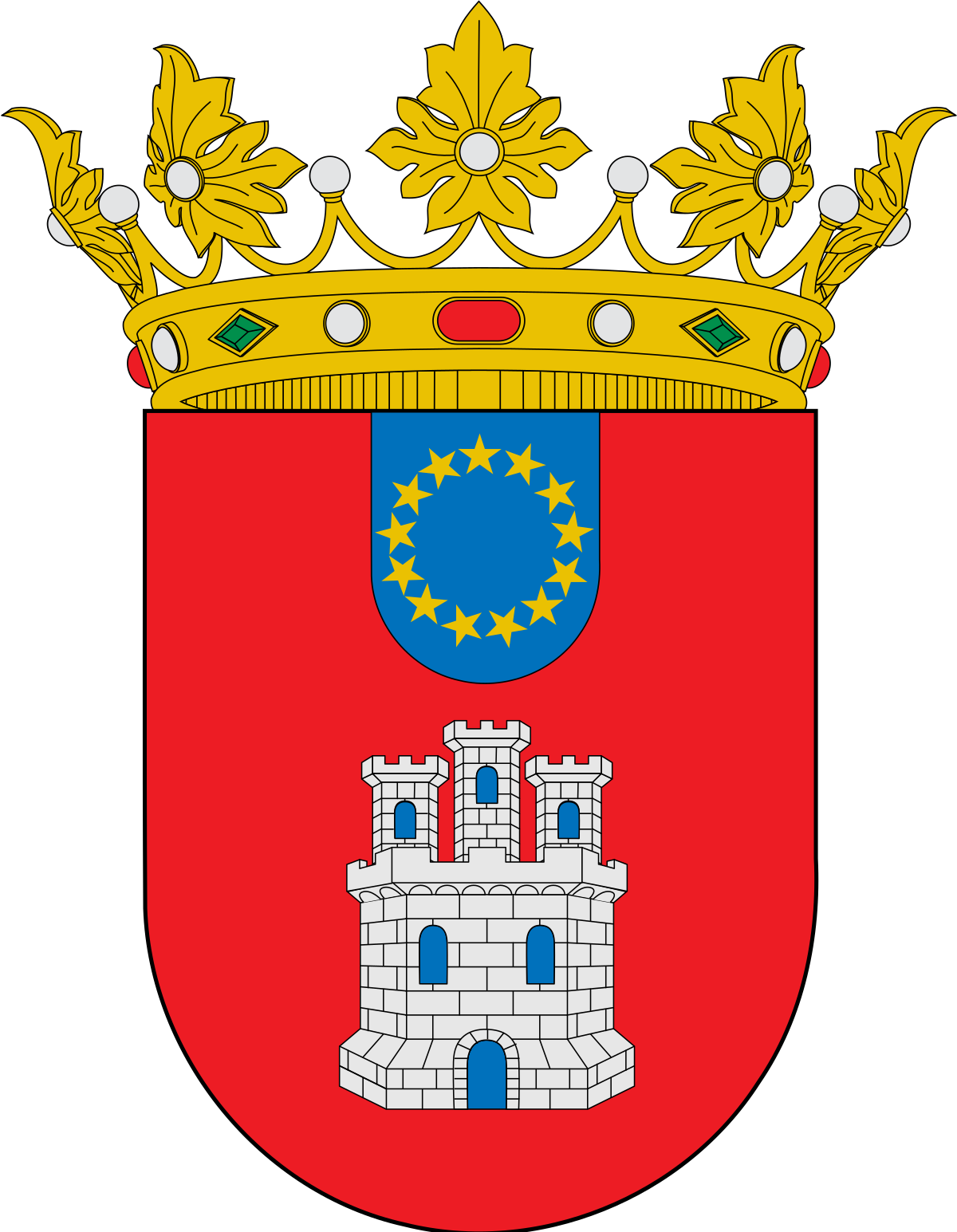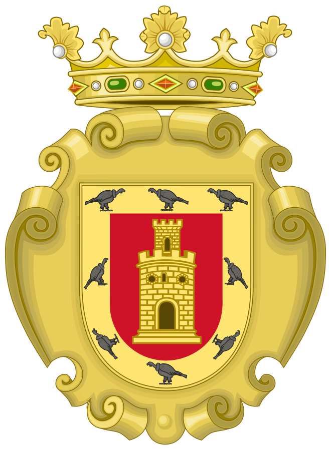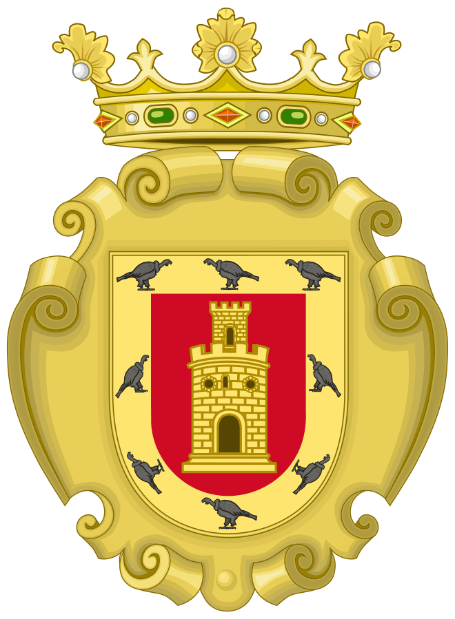 Medellín. Escudo otorgado en Madrid por real cédula de Carlos II de 31 de marzo de 1678. «Un escudo campo azul y en él un torreón muy grueso, redondo, todo alrededor almenado y sobre él un escudo de armas que tiene quince encajes, siete azules y ocho de oro, y sobre su coronel que le toca y en el homenaje de la torre a cada uno de los lados un torreoncillo, así mismo almenados y en medio de ellos puesta una imagen de Nuestra Señora sobre una nube, con su hijo en los brazos con la advocación de la Anunciación».