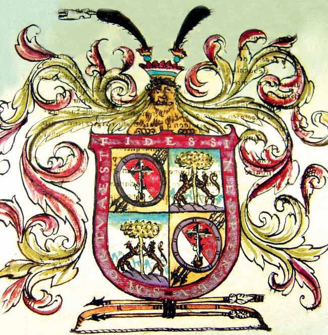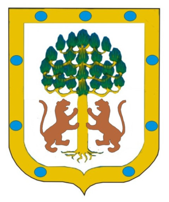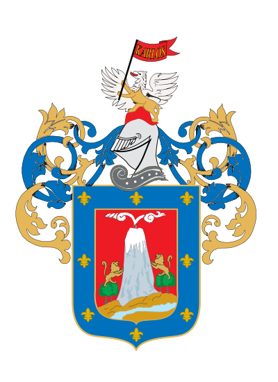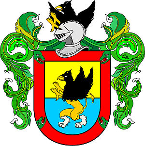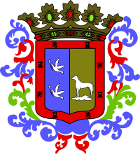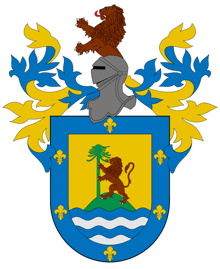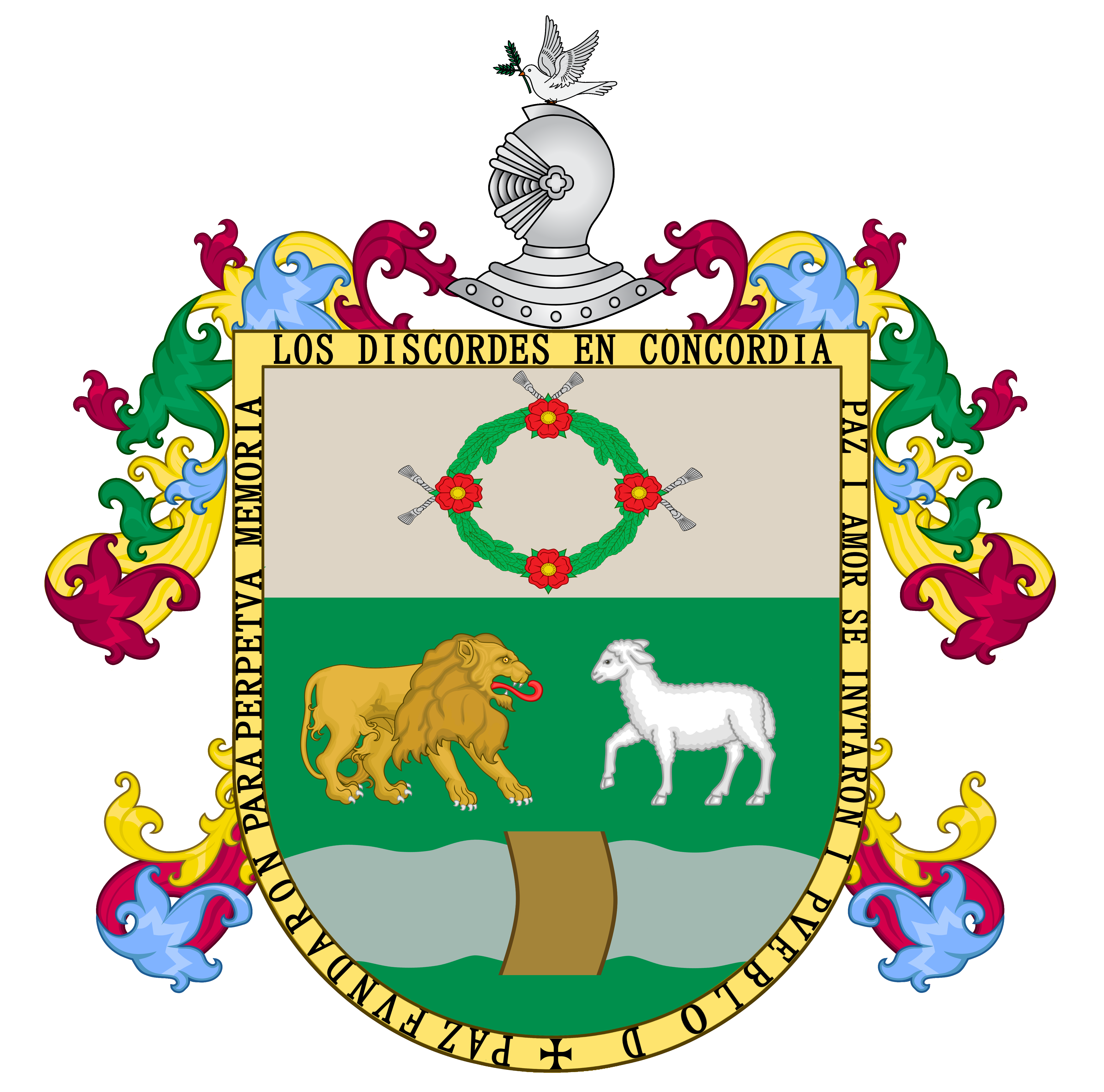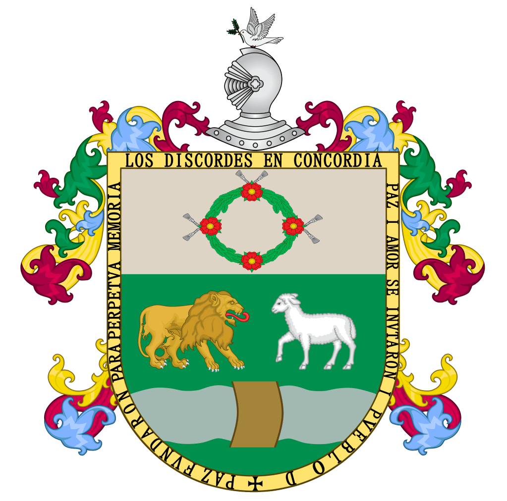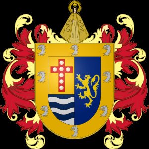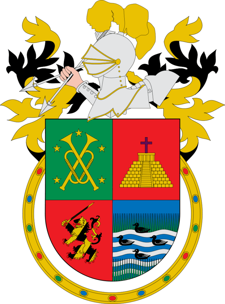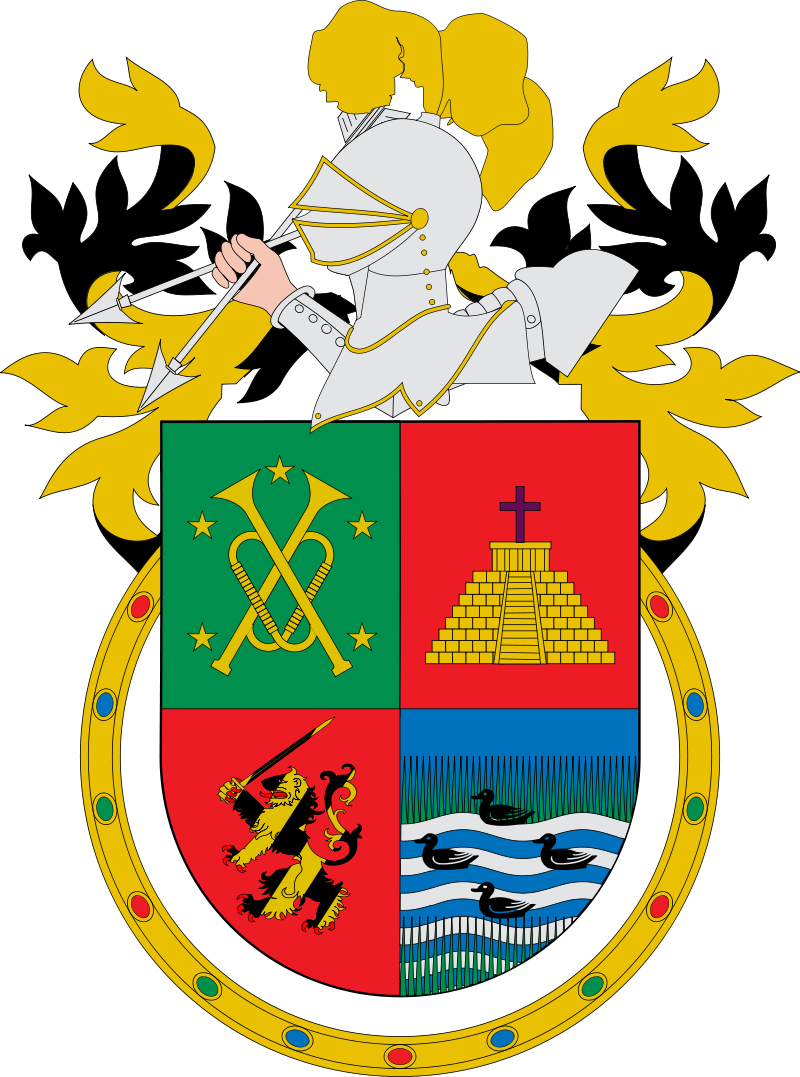 Coyoacán. Escudo otorgado en Madrid por Felipe II el 24 de julio de 1561. «Hecho de cuatro partes que en la primera de la mano derecha esté una rodela y con un circulo redondo morador, que en el medio de este una cruz con las armas de Santo Domingo que esta a manera de flores de lis, color de plata y negro, que salga por la boca de una cabeza de raposa en campo de plata y colorado por banda con tres saetas a manera de las que traen los indios, en campo de oro, y en la otra parte de la mano izquierda abra oro cuarto que en el medio de él esté un árbol verde asentado sobre un campo y más lejos que estén arrimados al dicho árbol: a la mano derecha un tigre puesto en salto y a la otra parte izquierda un león pardo en salto de campo de cielo y en las otras dos partes de abajo los dichos dos cuartos; que en el primero esté a la mano izquierda y el de la mano izquierda a la parte derecha con los mismos colores y armas que los de arriba y una orla con unas letras que digan Fides sine a paribus mortua est. En campo colorado y letras de plata y por divisa un león frentero que tenga con las manos el dicho escudo con su rollo feston; que encima de la cabeza salgan dos penachos y florones y dependencias a follajes verde y colorado y en bajo de dicho escudo un arco con dos saetas colgadas».