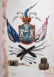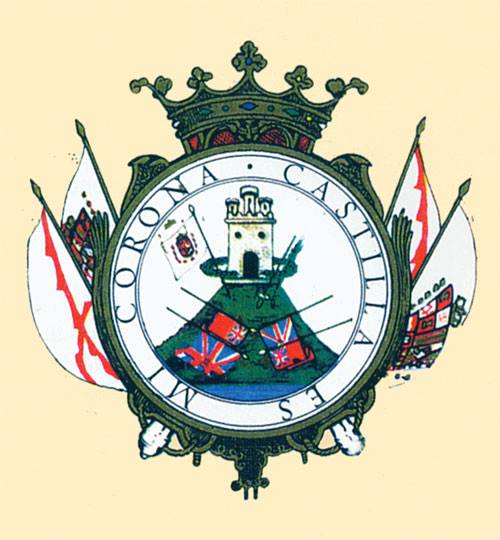 Montevideo. Su primera versión fue realizada en el año 1807 y estaba conformada por un óvalo con una corona encima. En su interior, figuraba en color verde el Río de la Plata. También aparecía el Cerro de Montevideo y el Castillo del Cerro. Su lema era “Castilla es mi corona”. La segunda versión fue conferido por real cédula de 25 de mayo de 1808. «A los pies del cerro de Montevideo aparecen cuatro banderas británicas tiradas en el suelo, dando la idea de la derrota británica y destacando la victoria española. También figuran al costado del cerro las banderas de la Cruz de Borgoña y de las Provincias Unidas del Río de la Plata. Arriba una corona real abierta».