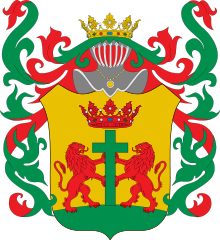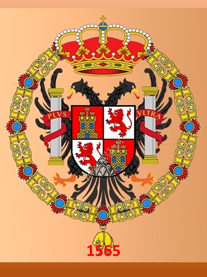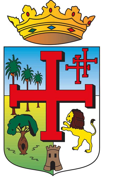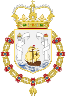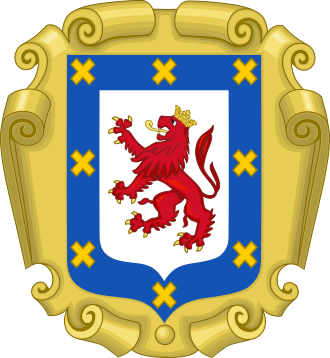 Cartagena de Indias. Escudo otorgado por Felipe II de España por real cédula de 23 de diciembre de 1574. «conformado por dos leones rojos y levantados, que tengan una cruz en el medio, asida con las manos y tan alta como los leones, hasta arriba, en campo dorado, y encima de la cruz, una corona entre las cabezas de dichos leones, con su timbre y follajes».
