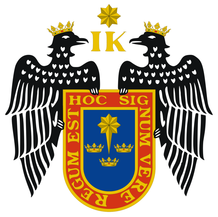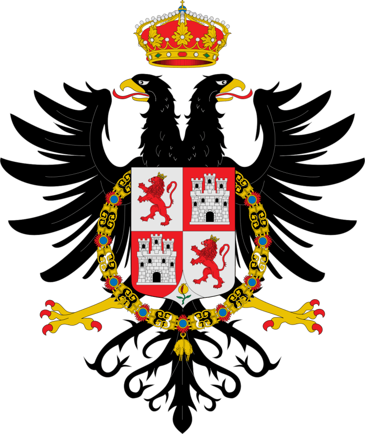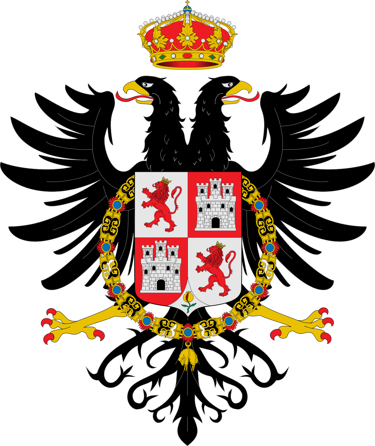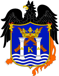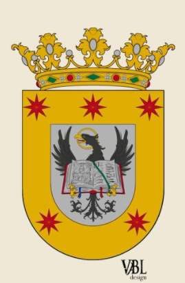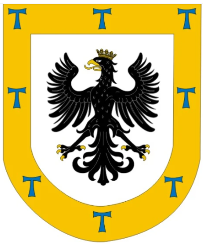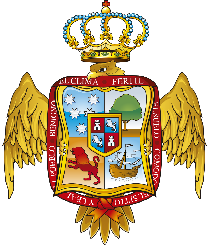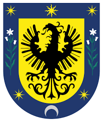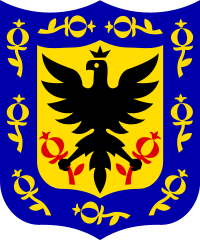 Santa Fe de Bogotá. Escudo otorgado en Valladolid por el rey Carlos I de España y su madre Juana I de Castilla por real cédula de 3 de diciembre de 1548. «Un escudo que en el medio del haya un águila negra rampante entera coronada de oro que en cada mano tenga una granada colorada en campo de oro y por orla unos ramos con granadas de oro en campo azul».