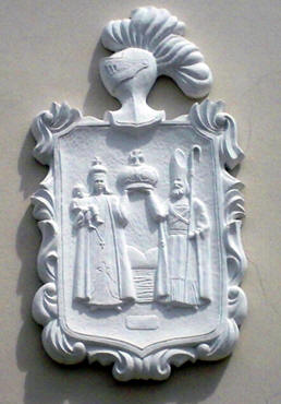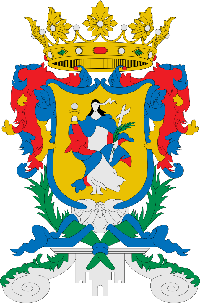 Santa Fe de Guanajuato. Escudo otorgado en el Buen Retiro por Felipe V de España el 8 de diciembre de 1741 que a su vez le dio el título de «Muy Noble y Muy Leal Ciudad de Santa Fe y Real de Minas de Guanajuato”. «De oro, una mujer de plata vendada de los ojos de lo mismo, cabellada de sable y vestida de azul y gules, sosteniendo y levantando en su mano diestra un cáliz de oro sumado de una hostia de plata y con la siniestra una cruz latina de plata y una palma de sinople. Por su base se enlaza en una concha sostenida por dos ramos de laurel lazadas por una cinta azul; apoyándose el todo sobre una repisa de orden compuesto, que representa ser de mármol de colores con adornos de oro. Forma su cabeza o copete del escudo, una corona sostenida por un tablero de hojas de acanto».