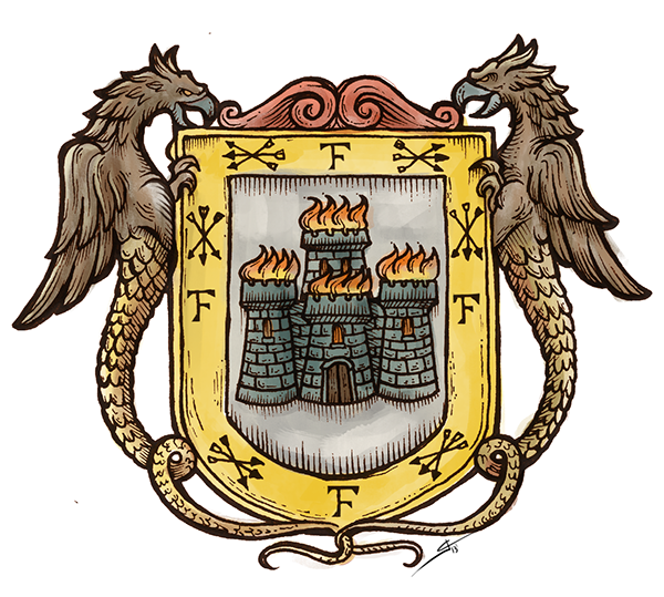 La Serena. Escudo y título de ciudad otorgado en Madrid por cédula real de 4 de mayo de 1552 por Carlos I de España. «Consiste en un castillo que hace de jefe en campo de argen o color plata con cuatro torreones arrojando llamas de las almenas. Sobre la bordadura aparecen cuatro F F y en sus ángulos haces de cuatro saetas invertidas. Sus soportes son dos grifos, haciendo presa de un eslabón«.