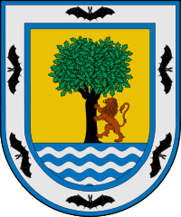 Santa Fe de Antioquia. Escudo otorgado en Valladolid por el rey Carlos I de España por cédula real de 7 de febrero de 1545. «Un escudo raso simulado a mantel, dos cuarteles, uno su fondo en oro en alto, y el otro en agua con ondas de plata y azul; en su centro un roble con grueso tronco en sable; a su lado un león rampante en su color, cogido del árbol; orla de plata con seis murciélagos de sable, en vuelo, abiertas las fauces y listas para chupar. Todo el escudo bordeado de azul».