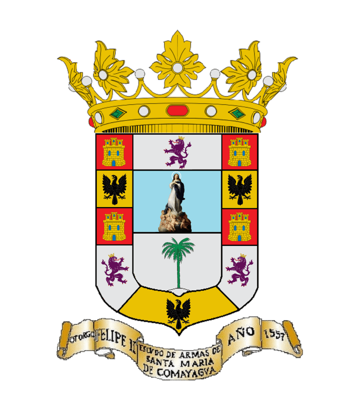 Nueva Valladolid de Comayagua. Título de ciudad y derecho de usar escudo de armas otorgado por cédula real de Felipe II el 20 de diciembre de 1557. «Escudo partido en dos, en el primer campo de plata se encuentra la santísima concepción, Patrona de la Ciudad, en el segundo del mismo metal se encuentra una palmera de sinople.- La bordura del Escudo es de metal de oro, gules y azur y en ella se encuentran cuatro castillos de plata, en campo azur tres leones de oro de campo de gules y tres águilas de sable en campo de oro».