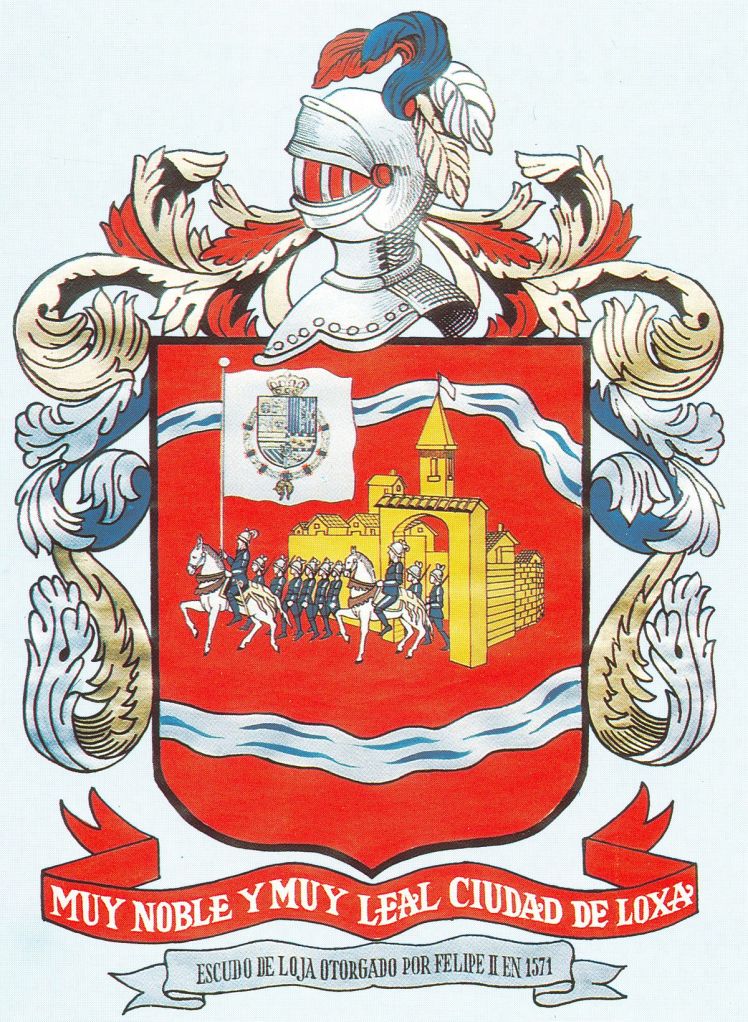 Loja. El rey Felipe II, el 11 de noviembre de 1567 le confirió el título de «Muy Noble y Muy Leal Ciudad de Loja» y el 5 de marzo de 1571 en Madrid le concedió su propio escudo. «Un escudo en campo rojo, que en medio del esté una ciudad de oro y salga de ella una bandera blanca con nuestras Armas Reales en ella y tras ella mucha gente de guerra que la sigue, y la ciudad esté cercada por dos ríos de azul y plata»