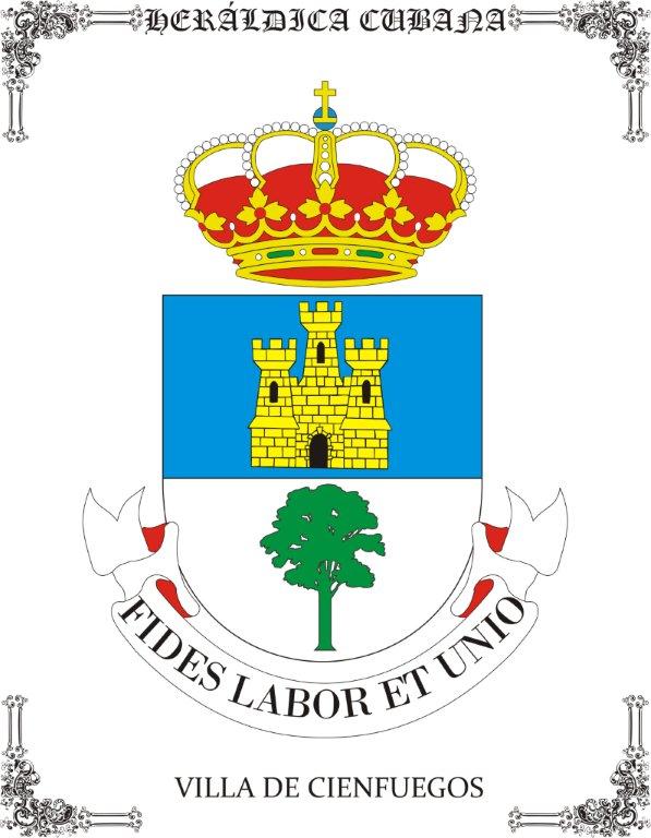 Cienfuegos. Escudo otorgado por real orden de Isabel II de 2 de abril de 1848. » Dividido en dos cuarteles. En el superior, sobre el campo azul, aparece el frente dorado del Castillo de Jagua, y en el inferior, sobre el campo de plata, una jagua en producción; lo remata una corona real y debajo la divisa Fides labor et Unio, Fe, Trabajo y Unión».