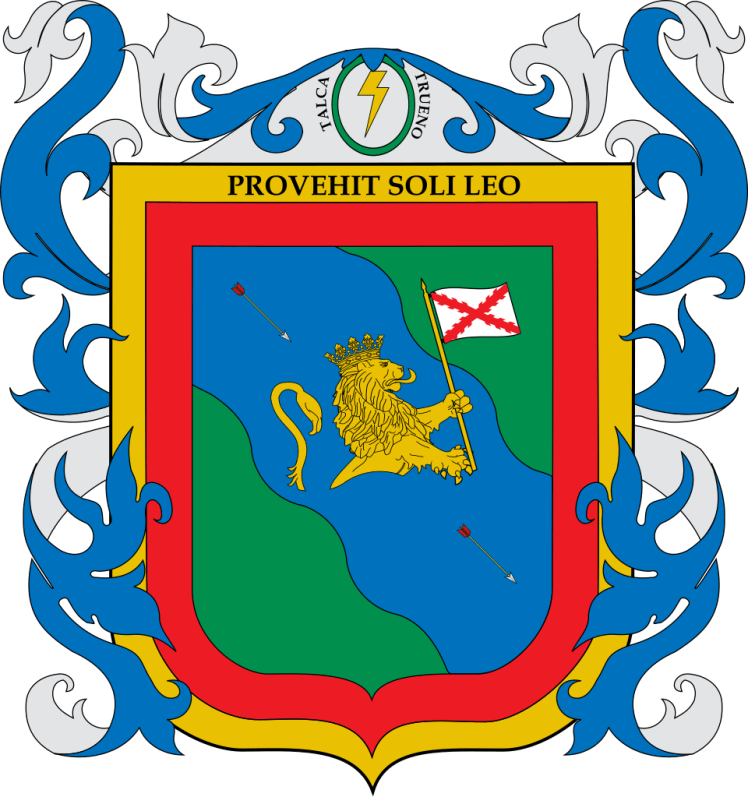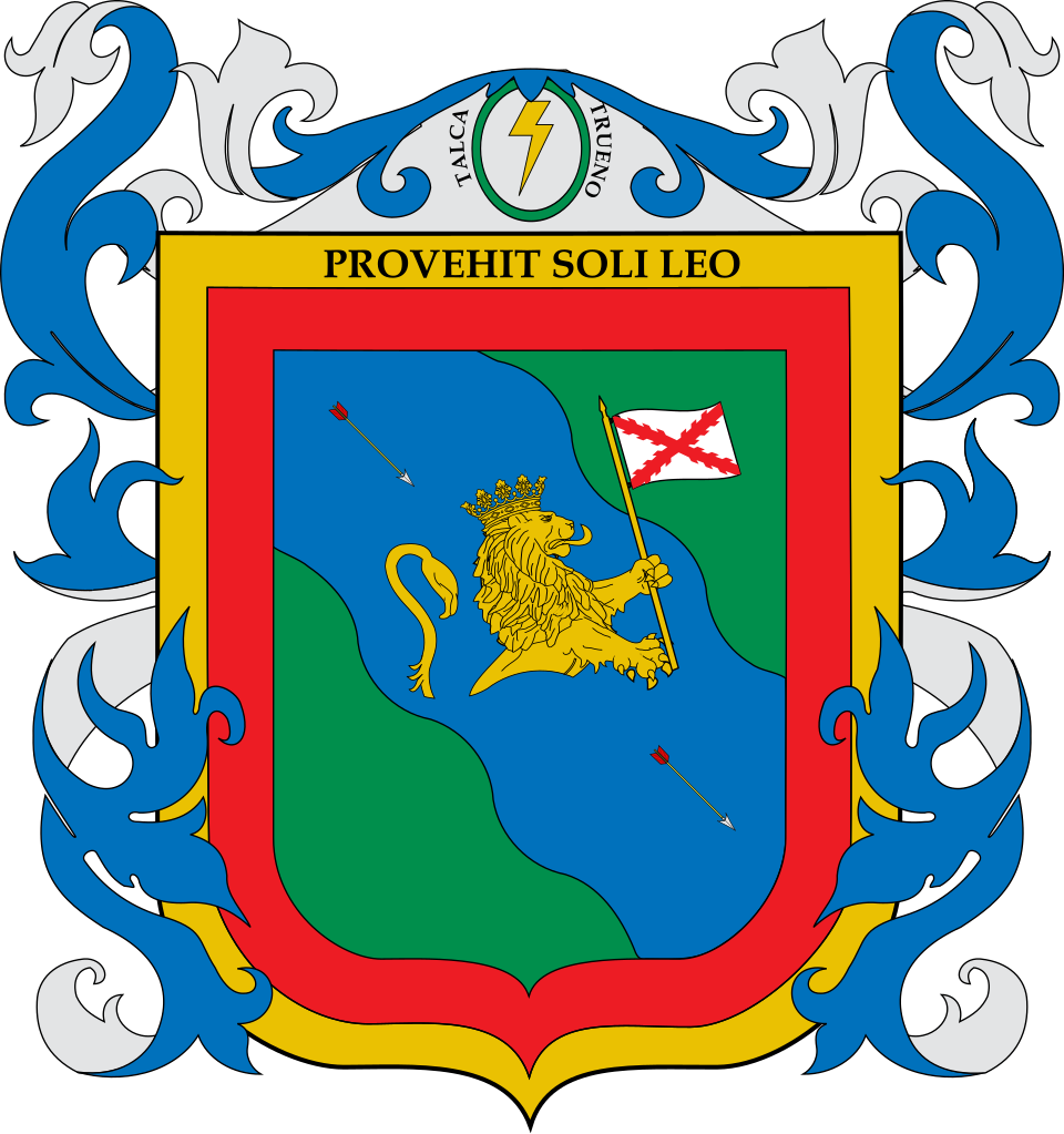 San Agustín de Talca. Escudo concedido por el gobernador de Chile Manuel de Amat y Juniet en 1760. «Que su fondo se denote en todo su campo verde con el río Maule descendiendo del ángulo izquierdo al derecho, de su color azul y sus saetas; en su centro, en forma de pasar el riente sus olas, desde la parte inferior izquierda a la derecha superior un león coronado, color amarillo con un estandarte en la garra, saliente de él una bandera blanca y en medio de ella una Cruz de Borgoña con su inscripción latina en la parte superior, que diga: «Provehit soli leo», y en la cúspide de la orla, un óvalo con un rayo candente y por colaterales las expresiones Talca-Trueno». El 6 de junio de 1796 el rey de España le concedió el título de Ciudad y poco después el de “Muy Noble y Muy Leal” y por real cédula del 23 de marzo de 1797, se confirmaba dicho blasón.