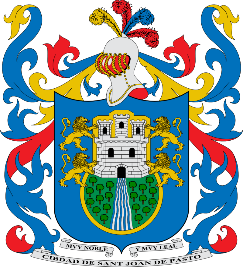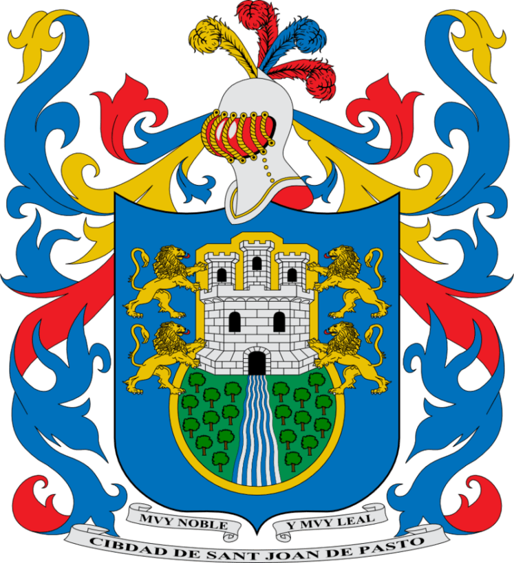 San Juan de Pasto. Escudo concedido por la princesa Juana de Austria en nombre de Felipe II, por medio de la real cédula dada en Valladolid el 17 de junio de 1559. «Que en el medio de él esté un castillo de plata, y a los lados cuatro leones de oro, y que debajo de dicho castillo salga un río con unas aguas azules y blancas que atraviese entre unos árboles verdes, en campo azul todo dicho escudo, y árboles y castillo y río sobre un campo amarillo y suelo verde y oro»