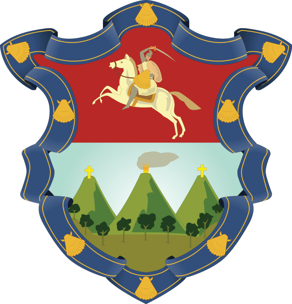 Cartago. Escudo concedido por Felipe II por real cédula el 17 de agosto 1565. «Un escudo partido en dos, en la parte de arriba hay un león rampante puesto en salto, en campo colorado, con una corona en la cabeza y con tres barras de sangre, en la parte de abajo, un castillo de oro en campo azul. El blasón tiene seis águilas negras en campo de plata, y por divisa, una corona grande de oro con un letrero que dice Fide et pace».