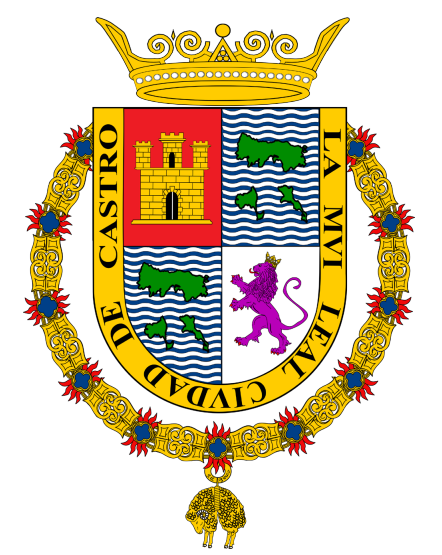 «Escudo cuartelado; 1.º, un castillo almenado de oro, donjonado con tres torres, todo mazonado, y con la puerta principal y asimismo la de la torre principal, en sable; 2.º y 3.º, diecisiete ondas marinas de azur y plata, tres islas de sinople mal ordenadas: una grande y acostada en jefe (la Isla Grande de Chiloé), y en punta dos puestas en palo y colocadas en faja (Lemuy y Quinchao); 4.º, un león rampante coronado, lampasado y uñado de gules. Bordura de oro (sin cubrir las partes superiores de los cuarteles 1.º y 2.º) con la leyenda “LA MVI LEAL CIVDAD DE CASTRO”, escrita desde el cuartel 2.º hasta el 1.º, en sentido dextrógiro. Orlado con un Toisón de Oro; y corona real».