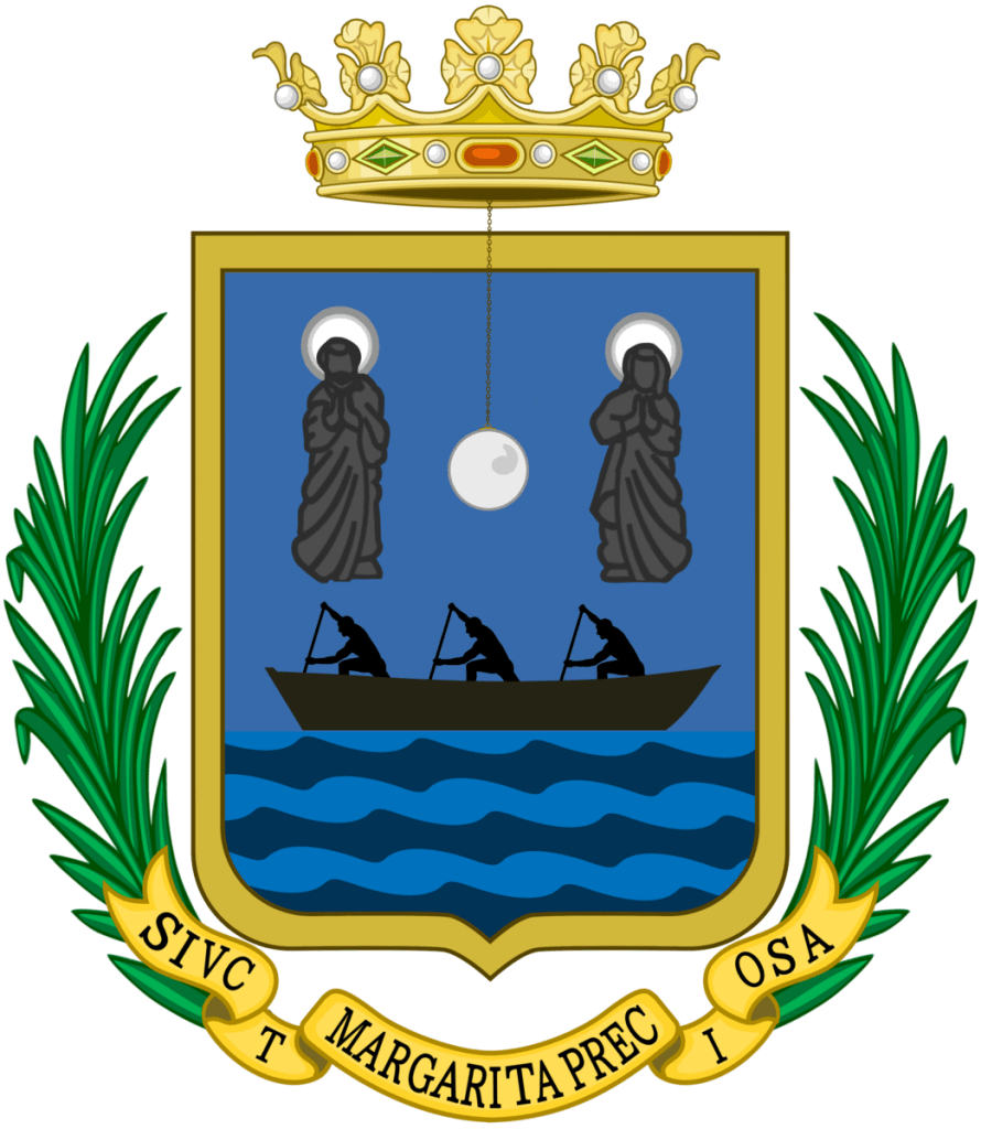 La Asunción (isla Margarita). Recibió el título de ciudad, y su correspondiente escudo, por una real provisión dictada en el Pardo (Madrid) el 27 de noviembre de 1600. «La mitad del campo azul, con una canoa en medio y los negros de la pesquería, y en el ] hueco hondas de mar, y en lo alto del escudo a los dos lados de él San Felís y San Adaut, que son abogados de la dicha çiudad, y ençima del dicho escudo una corona, de la cual penda una perla que llegue hasta el campo azul, y por los lados unas letras que digan Sicut Margarita preciosa».