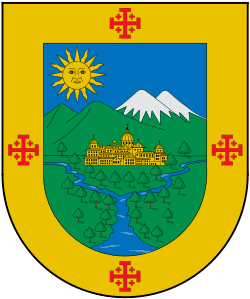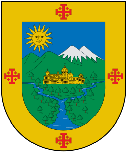 Asunción de Popayán. Escudo concedido por Juana de Austria a nombre de su hermano el rey Felipe II de España, por real cédula dada en Valladolid el 10 de noviembre de 1558. «Que en el medio de él esté una ciudad de oro, con unas arboledas verdes a la redonda de ella, y dos ríos: el uno, de la una parte de la dicha ciudad, y el otro de la otra, entre arboledas verdes y aguas azules y blancas; y en lo alto, a la mano derecha, una sierra nevada, y un sol encima de la dicha sierra, en campo azul, y una orla con cuatro cruces de Jerusalén coloradas en campo de oro».