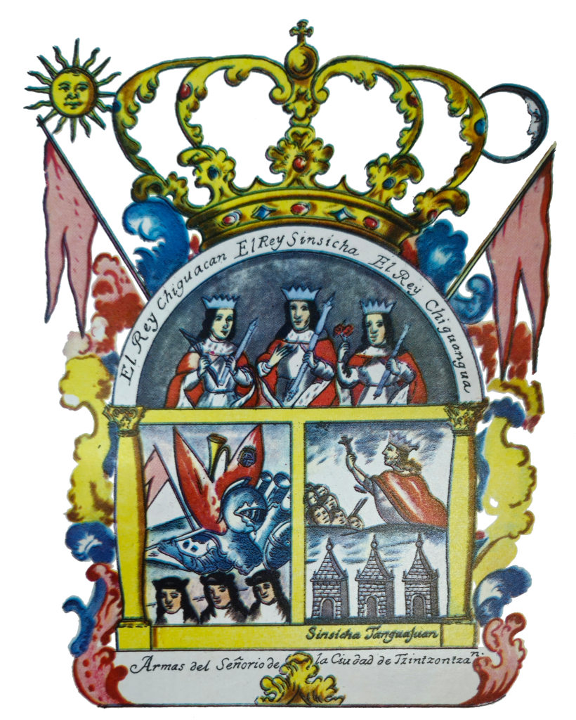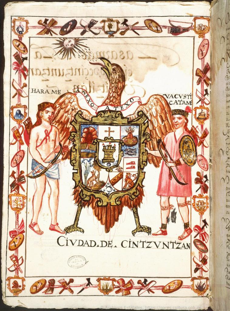 Tzintzuntzan. Oficialmente el primer título de “Ciudad de Mechuacan” le fue otorgado a Tzintzuntzan el 28 de septiembre de 1534 por el Rey Carlos I de España (AGI). Hay tres versiones del escudo, la primera de 1595 (AGI). El segundo es de 1702 (Museo Regional de Michoacán). El tercero es de 1792 (AGN).