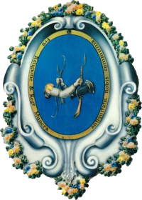 Marinilla. Escudo otorgado por Carlos IV en Aranjuez por real cédula de 25 de junio de 1795. «Ceñido el todo de su empresa o emblema o dos brazos de encarnación que sobre campo azul, símbolo este color de perseverancia, recompensa y lealtad, se hallan unido y vestidos a la española antigua y original traje indio, pendiente de la mano española el arpón y saeta y de la india el mosquete o fusil; poblado este escudo de oro y en demostración de su actual y futura prosperidad y de letras negras este lema «PRO RELIGIONES ET REGE MUNERA ANTIQUITATIS NOBIS COMUNIA» (Por la religión y el Rey nos son comunes los dones de los antiguos)».