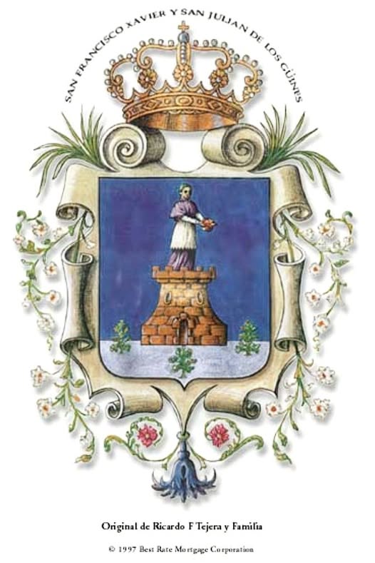 San Julián de los Güines. Escudo otorgado por el Consejo de Indias según real cédula de 9 de marzo de 1818 a la villa de San Francisco Javier y San Julián de los Güines. «Una corona de oro en su parte superior con una cruz, y dos racimos de frutas. En su parte interior tiene un castillo, sobre este San Julián, y en la parte inferior tres flores de tabaco».