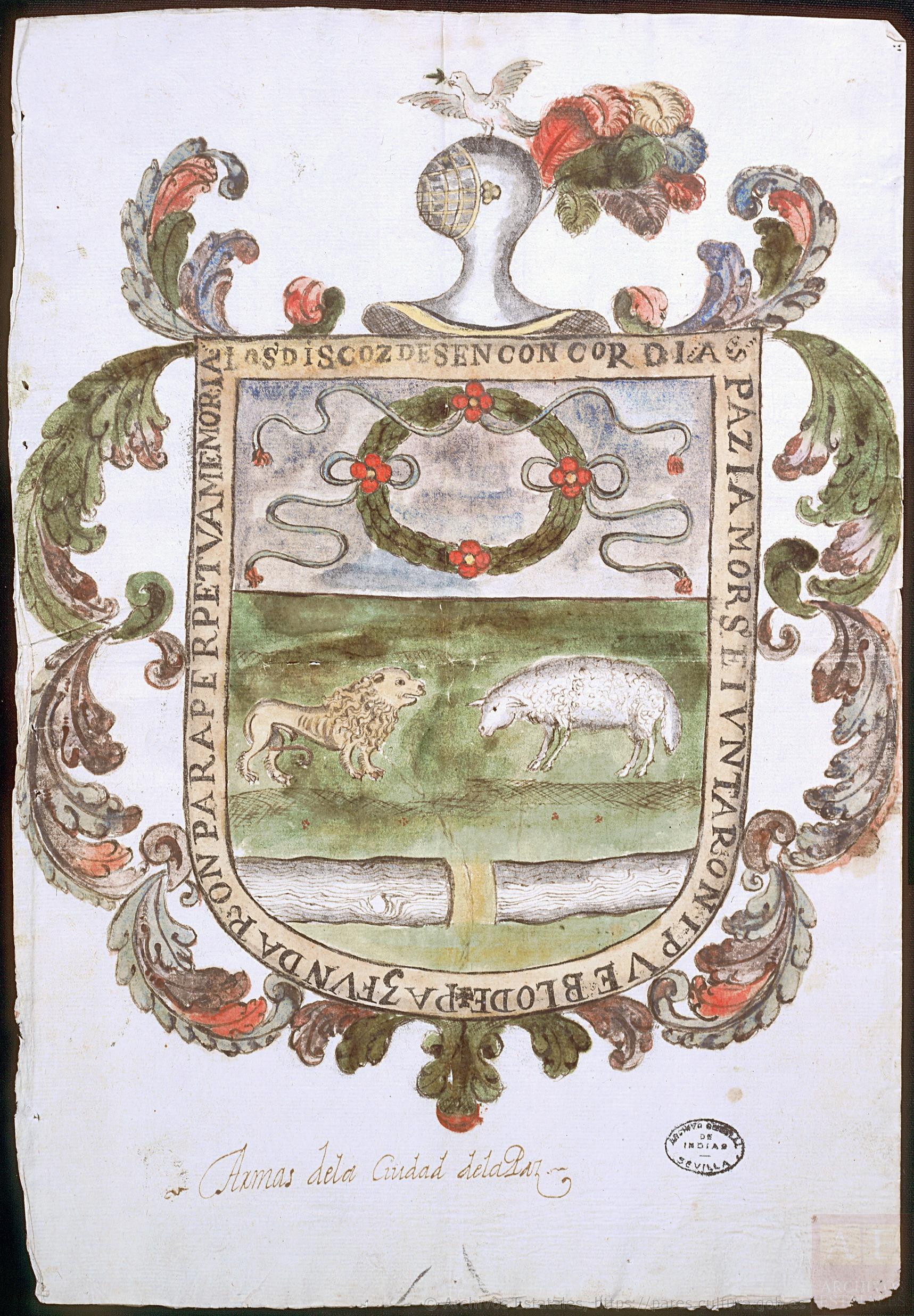 La Paz. En 1549, el emperador Carlos V concedió a la ciudad el título de «Ciudad de Primer Orden en el Nuevo Reino de Toledo». El escudo le fue concedido en Madrid el 1 de mayo de 1555. «En la parte superior un yelmo rematado por una paloma blanca, que lleva en el pico una rama de olivo. En la parte superior del centro, una corona de laureles que a manera de guirnalda central, es de sinople (verde) con rosas botonadas de gules (rojas) y está anudada por dos serpientes mirando hacia abajo. Debajo y de fondo el cerro nevado Illimani. En la parte central como una línea divisoria se observan las aguas cristalinas del antiguo Río Choqueyapu. En la parte inferior del centro, cuyo campo inferior es de sinople, representando un prado, se ubican un león en su color natural, parado, mirando a la siniestra y cobarde (la cola entre las patas), que es afrontado por un cordero de plata, parado, paciendo, y en posición adiestrada. 6. Alrededor y bordeando el escudo , una franja azul lleva la siguiente inscripción: Los discordes en concordia en paz y amor se juntaron y pueblo de paz fundaron para perpetua memoria.
