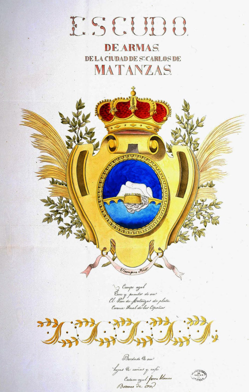 San Carlos de Matanzas. Escudo concedido por real cédula de Fernando VII el 14 de diciembre de 1828. «En campo azul el mar, con su color natural; después un castillo con un puente a cada lado (oro); al fondo el Pan de Matanzas (plata), con su paisaje y colores naturales; y los dos ríos; al fondo es el cielo. Arriba la corona real y debajo la divisa: siempre fiel.»
