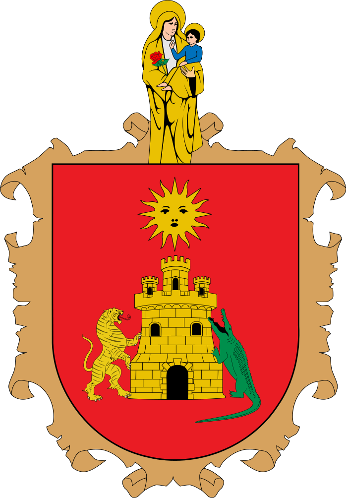 Villahermosa. Escudo otorgado por Felipe II el 24 de julio de 1598 a la ciudad de Villahermosa de San Juan Bautista. Desde 1892 es el escudo del Estado de Tabasco. «Contiene campo de gules y cuatro cuarteles sobre tela carmesí; el cuartel superior izquierdo, sobre campo rojo cuatro torres o castillos de oro simétricamente dispuestos en campo de gules; el cuartel inferior derecho, también sobre campo rojo, con un león rampante de oro con tres cruces pometeadas en campo de gules. En el centro, sobrepuesto en la unión de los cuatro cuarteles, un escudo u óvalo en el que aparece el busto de la Virgen María coronada de oro en campo de plata y sobre sus hombros un manto de color azul celeste; a cada lado del óvalo cual si fueron en sostenes, las columnas de Hércules, cada una con un mundo azul en el capitel, teniendo cada polo superior una cruz, en diagonal, de arriba hacia abajo, a media columna de la izquierda las palabras “NEC PLUS” y en la de la derecha «ULTRA». En el cuartel superior derecho, brazo armado de brazal empuñando espada en campo de plata; la india del campo inferior izquierdo lleva por corona un penacho, que solamente tiene plumas en la región frontal, y está en actitud de ofrecimiento de los ramilletes de flores que sostiene entre cada una de sus manos. El escudo sostiene en el centro del borde superior una corona real española, que está rematada con un mundo en cuyo polo superior descansa una cruz».