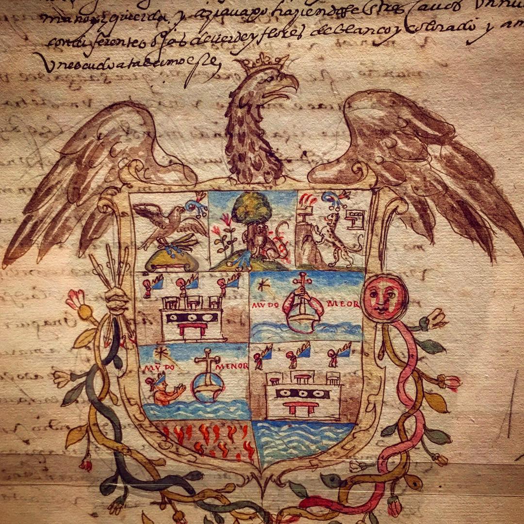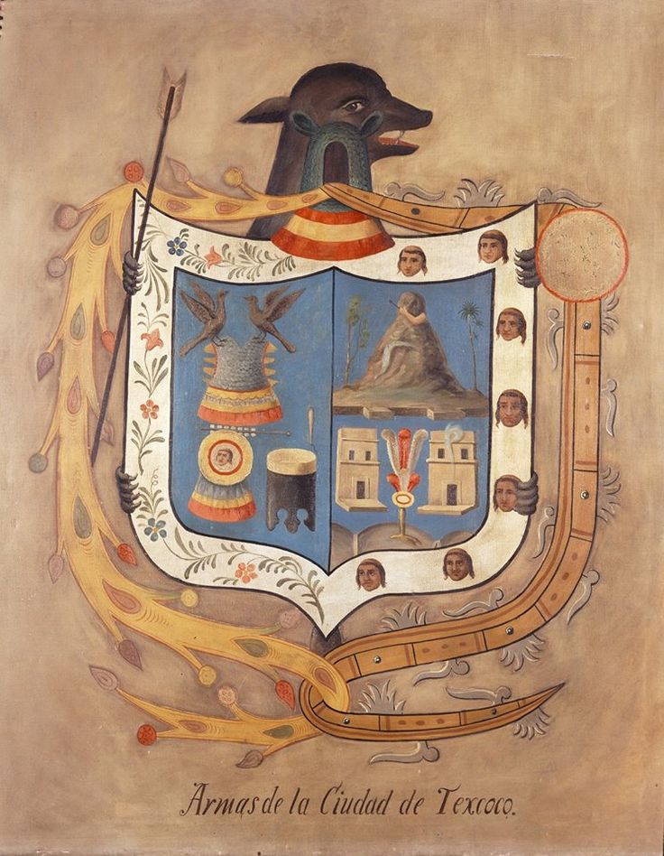 Texcoco. Otorgado el 9 de septiembre de 1551 en Valladolid, España a solicitud del cacique Fernando Pimentel y Alvarado al rey de España Carlos I. «El escudo de armas está estructurado por una cabeza de coyote en perfil derecho. Al frente y circunvalando al escudo hay dos orlas: la diestra representa a la cultura española y la siniestra a la cultura asentada en el lago de Texcoco. Debajo de la cabeza del coyote, al centro hay una cueva que representa el origen de las siete tribus nahuatlacas que se asentaron en la cuenca de México simbolizadas por siete cabezas de perfil derecho, cuyos reyes o señoríos fueron tributarios de Texcoco. Arriba, al centro hay un penacho de guerra texcocano; en el campo de la izquierda un vestuario de guerra llamado xiquipile, sostenido por dos águilas que hacen patente la coronación de Acolmiztli-Nezahualcóyotl como rey de Texcoco».